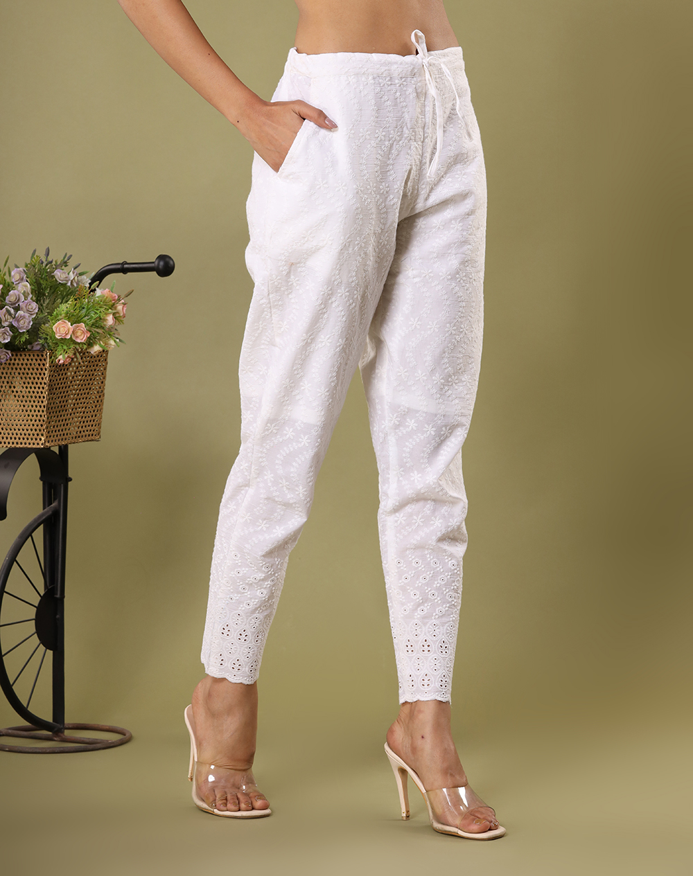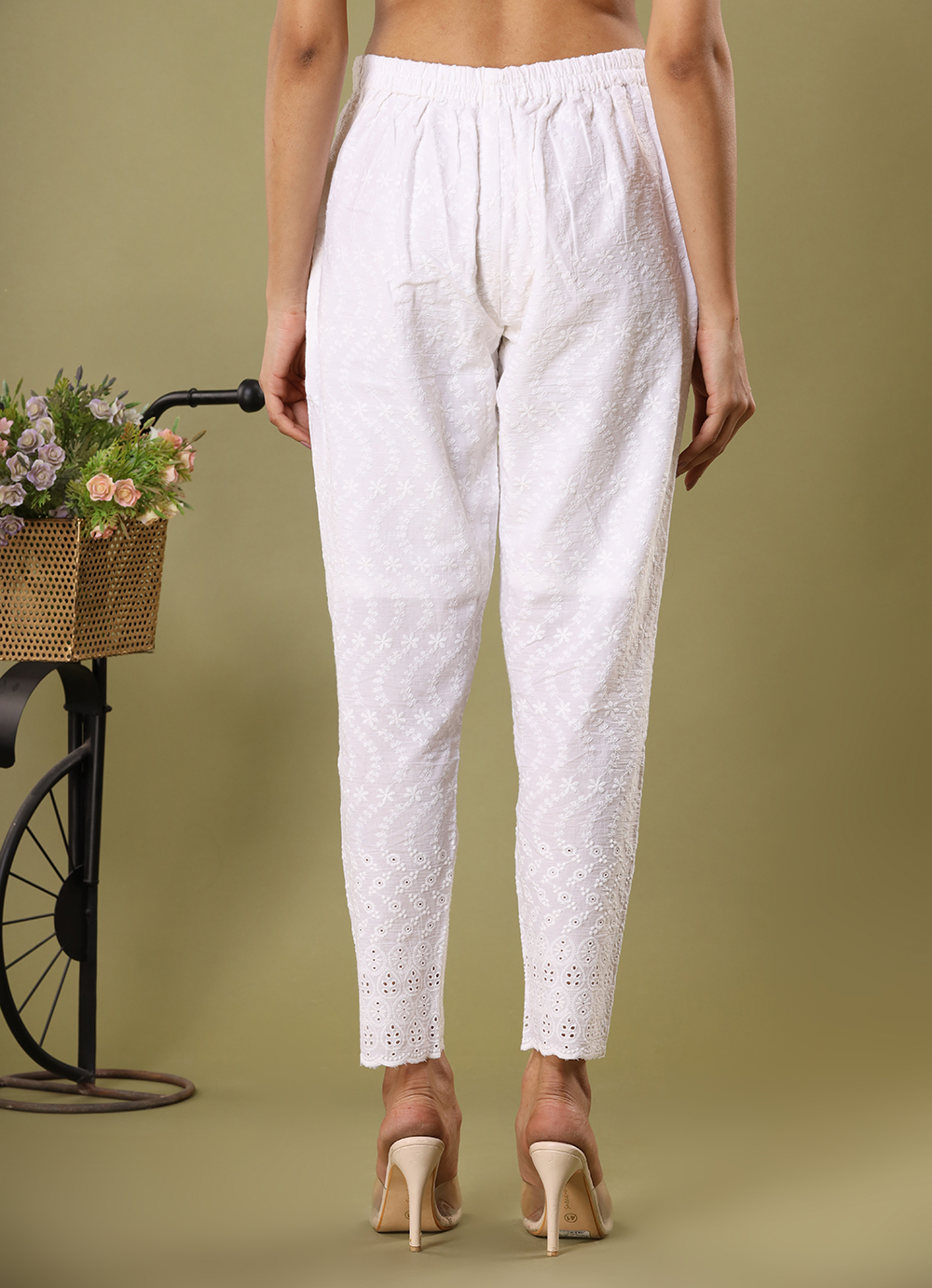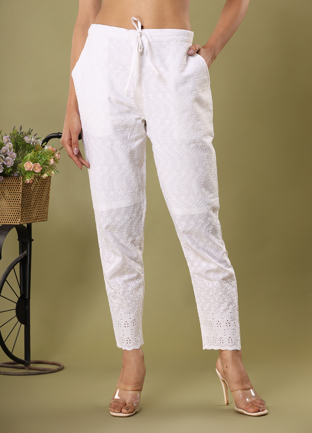 White Schiffli Embroidered Trousers